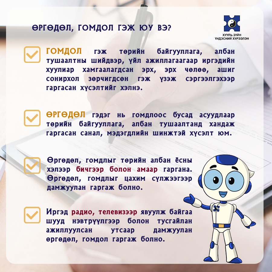 ИРГЭДЭЭС ТӨРИЙН БАЙГУУЛЛАГА, АЛБАН ТУШААЛТАНД ГАРГАСАН ӨРГӨДӨЛ, ГОМДЛЫГ ШИЙДВЭРЛЭХ ТУХАЙ хуулиас