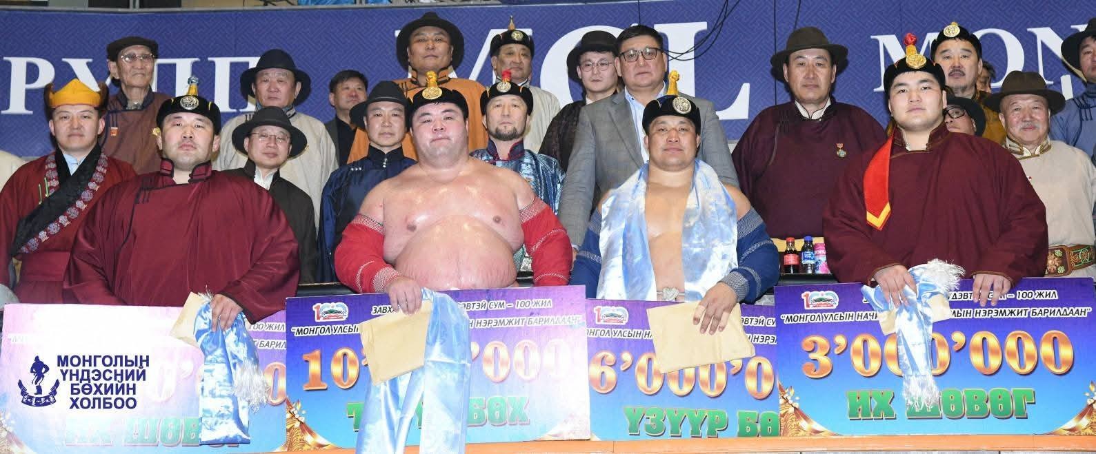 Бөхийн барилдаанд Хэнтий аймгийн Өмнөдэлгэр сумын харьяат, "Эв Монгол" клубийн бөх, улсын арслан Энхтөгсийн Оюунболд түрүүлж, Ховд аймгийн Чандмань сумын харьяат, "Эв Монгол" клубийн бөх, улсын заан Баатархүүгийн Пүрэвсайхан үзүүрлэлээ.